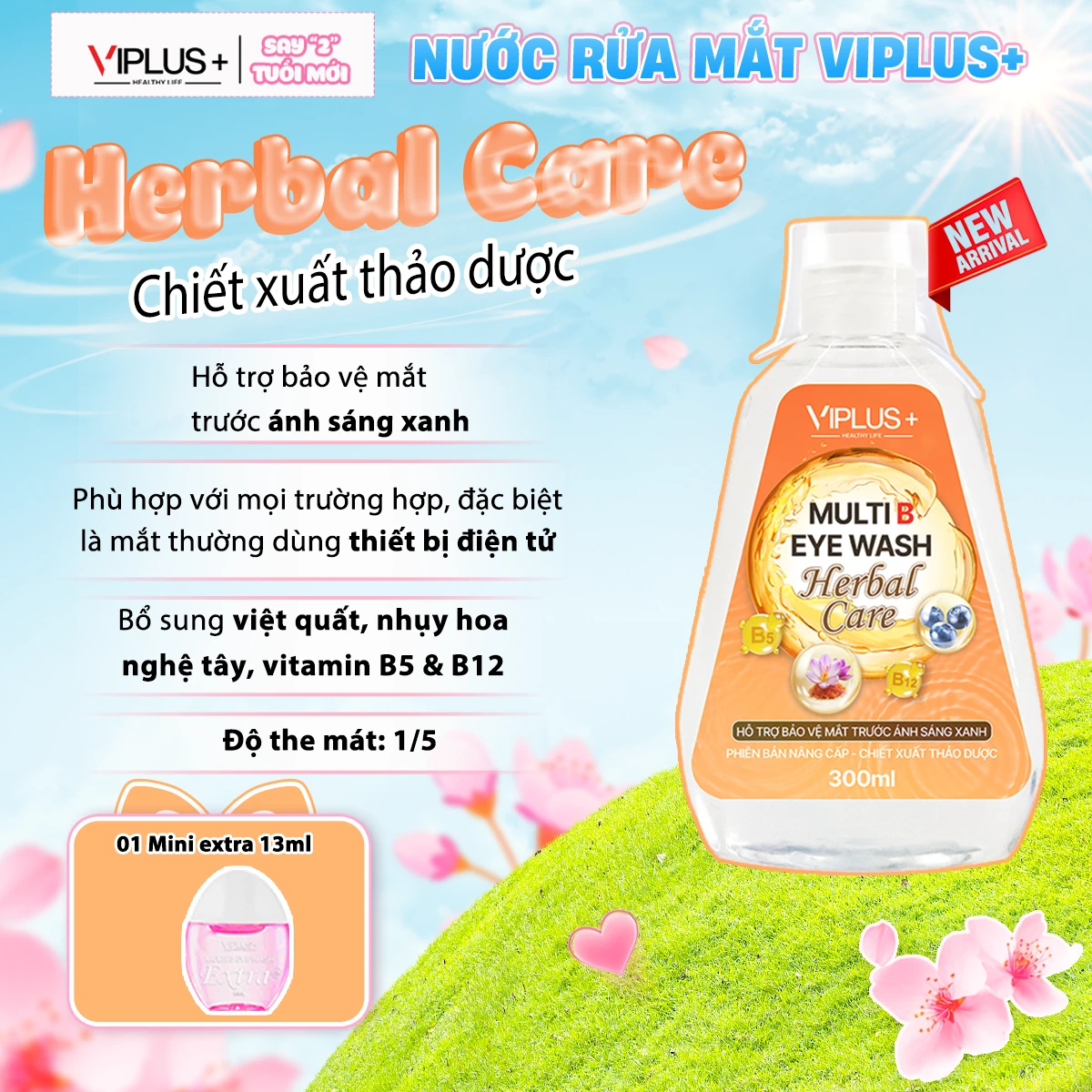 Nước rửa mắt thảo dược VIPLUS+ Herbal Care là một sản phẩm làm sạch và chăm sóc mắt, giúp làm dịu và giảm mệt mỏi. Thành phần chính của sản phẩm là chiết xuất nhụy hoa nghệ tây và việt quất, hai loại thảo dược được biết đến với khả năng chống oxy hóa mạnh mẽ. Đặc biệt, các chất chống oxy hóa trong việt quất giúp giảm căng thẳng và bảo vệ mắt khỏi tác động của ánh sáng xanh.